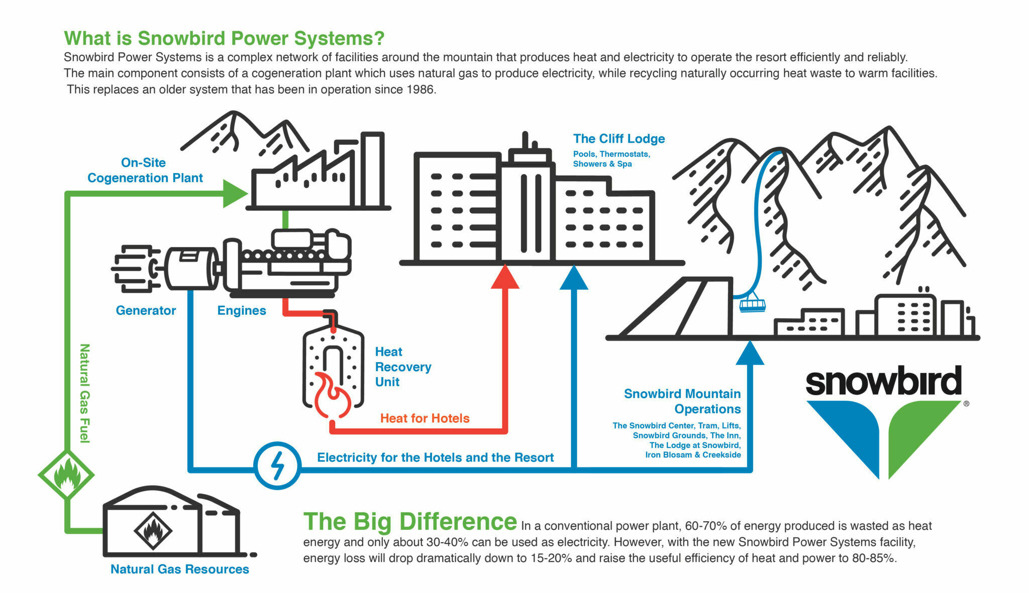 This new system will replace Snowbird’s older cogeneration system that’s been running since 1986 and was seen as a world-renowned engineering feat. The basics of this system is to heat given off by the electricity-producing engines and redistributing that heat to warm the building and water of their Cliff Lodge.